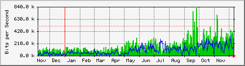 | Max In: | 827.3 kb/s (161.6%) | Average In: | 157.2 kb/s (30.7%) | Current In: | 246.2 kb/s (48.1%) | ||